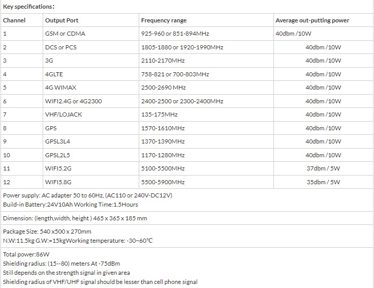 Cada unidade pode bloquear até 12 bandas de frequência simultaneamente, cada banda de frequência é separada e com potência ajustável de max a off (0)